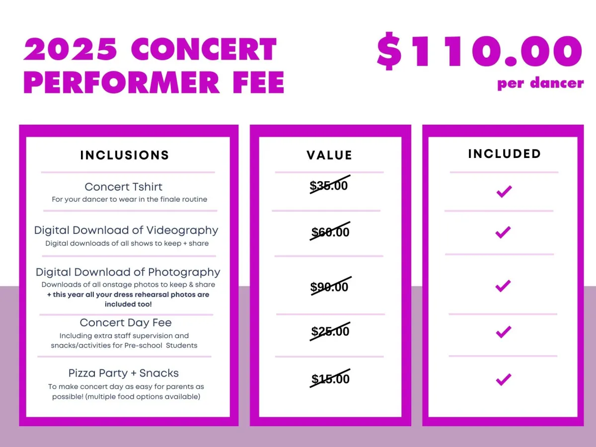 Your Concert Performer Fee helps us make concert day magical, organised, and enjoyable for every dancer and their family.